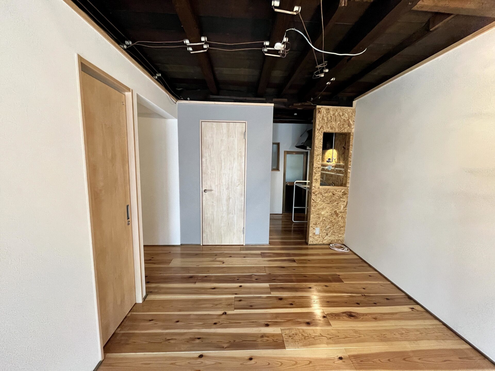 既存の構造を活かしながらOSB × 無垢材で仕上げることで、ローコストリノベーション工事を実現。